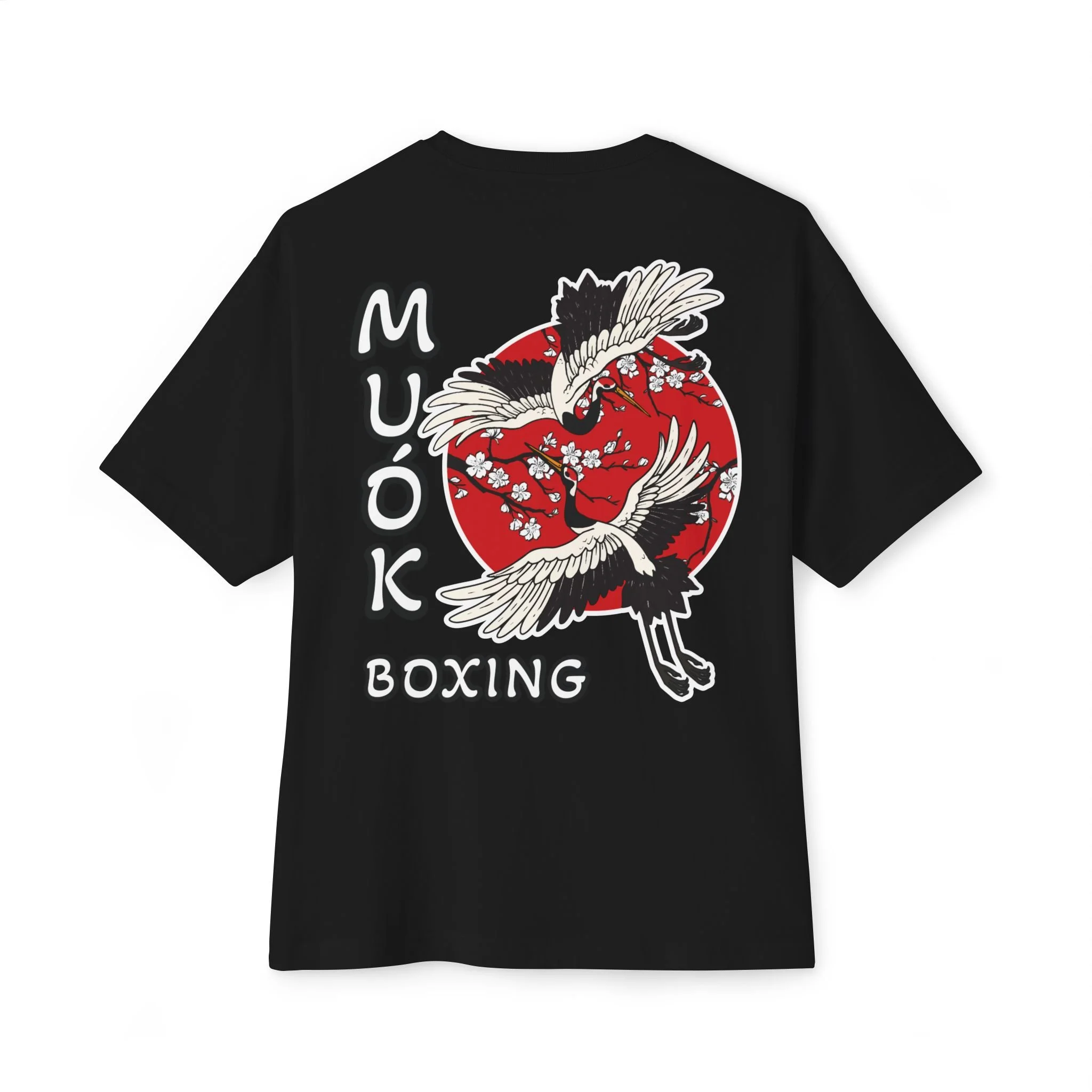This oversized boxy tee brings martial arts edge to everyday wear. On the front, a small, subtle logotype sits near the chest in warm gold tones; the back unlocks the personality — a red circular crest filled with stylized cherry blossoms and two cranes in mid-flight, framed by bold hand-lettered type that reads “MUÓK BOXING.” The shirt drapes with relaxed, dropped shoulders and a roomy silhouette that lets movement feel effortless, whether you’re wrapping hands before a training session or walking through the city after class. The medium-weight cotton feels sturdy but breathable; stitching at the neck, sleeves, and hem keeps the shape wash after wash. It’s a piece that reads like team gear and streetwear at once — quiet on the front, expressive on the back — meant for people who train hard and carry that discipline into how they move through the day.